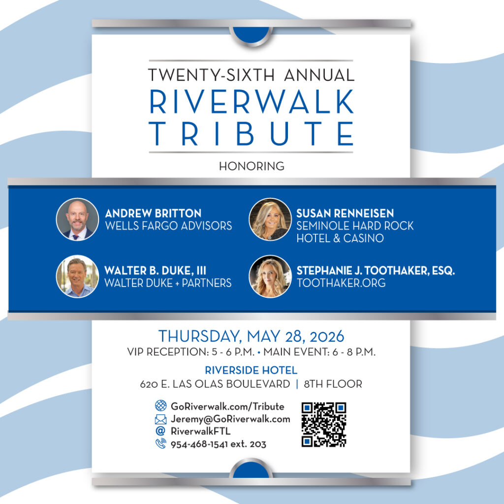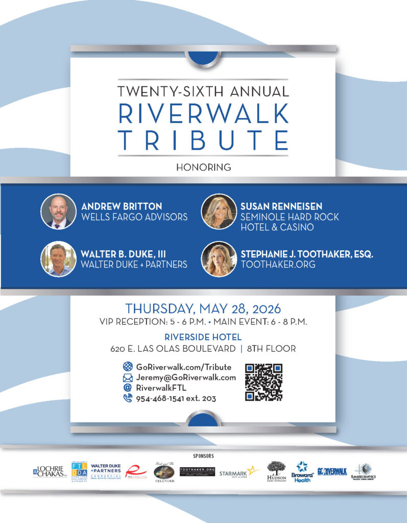Sponsors for the 26th Annual Riverwalk Tribute include: Walter Duke + Partners, The Hudson Family Foundation, Lochrie & Chakas, P. A., TOOTHAKER.ORG, Flo and Rick Celender, Broward Health, Starmark, RCC Associates, Fort Lauderdale Downtown Development Authority, S. Mark Graphics & Go Riverwalk Magazine.