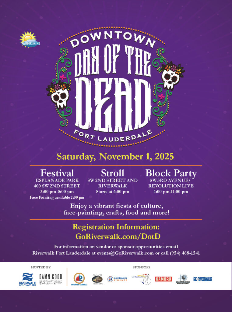 The Downtown Day of the Dead Celebration is proudly produced by Riverwalk Fort Lauderdale and Damn Good Hospitality (Revolution Live, Backyard FTL, Stache), with major support from the City of Fort Lauderdale and in partnership with the Mexican American Council, General Consulate of Mexico in Miami and Las Olas Capital Arts. Additional support comes from Morningstar Storage – FAT Village and Kamora.