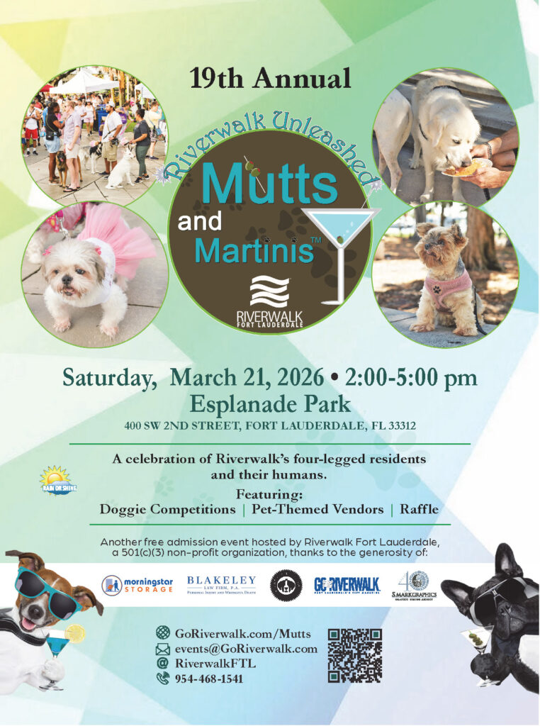 Saturday, March 21, 2026, will be a tail-wagging afternoon of fun along Fort Lauderdale’s scenic Riverwalk! This beloved community tradition brings together dog lovers, their four-legged companions, and the vibrant Riverwalk neighborhood for an unforgettable celebration of all things canine, and of course -martinis. Guests can cheer on adorable competitors in the Peanut Butter Eating Contest, admire creative and stylish looks during the Doggie Fashion Show, and browse a variety of pet-themed vendors offering treats, accessories, and unique finds for dogs and dog lovers alike. Plus, don’t miss your chance to win exciting raffle prizes designed especially for pets and their people.